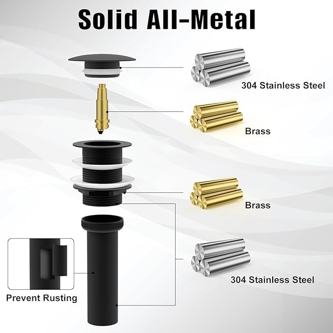 Dive into a cleaner, more convenient bathroom experience with the ZM Pop Up Drain Stopper. Designed to fit standard sink holes measuring up to 1-5/8 inches, it offers a perfect seal that prevents overflow and keeps your space dry and tidy. No more worrying about water pooling or clogs â this drain stopper is built for reliability and ease of use. Featuring a sleek Matte Black finish, this drain stopper effortlessly blends into any bathroom decor, whether modern or traditional. Crafted from durable 304 stainless steel, it's built to last through years of use without rust or wear. The no-tool installation system makes it simple to set up, ensuring hassle-free bathroom sink installation for homeowners and renters alike.ZM Pop Up Drain Stopper â Hassle-Free Draining for Every Bathroom